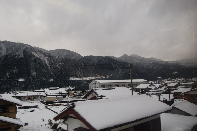As it turns out, this was the first time I would see a Japanese train late. It arrived only about 6 minutes late, but made my connection all the more tricky. I ran and got the bus ticket, only to get back to the queue to find the bus was too full, and to not be allowed on. Luckily, they pulled another bus from somewhere and we set off on an hour long bus ride still further up the mountains and snow covered slopes to Hirayu Onsen. The road was so so heavily covered in snow the bus was crawling for most of the trip, and frequently had to drive on the fresh snow to avoid shaking it to pieces on the caterpillar tracks left by the snow plough from earlier that day. We finally made it to our stop, and then I had fun of trying to drag a wheely case over the snow to my Ryokan, this 1 minute walk was not a problem, except for the driver of a car who had managed to spin his car and get stuck on the only road through the village. All hands to the rescue as everyone able tried to help push the car back on to something it could grip – in the end a passing motorist got out a tow rope and the rest of us went on to our Inns.